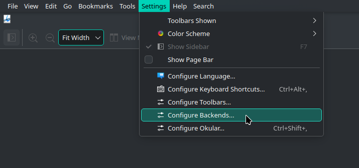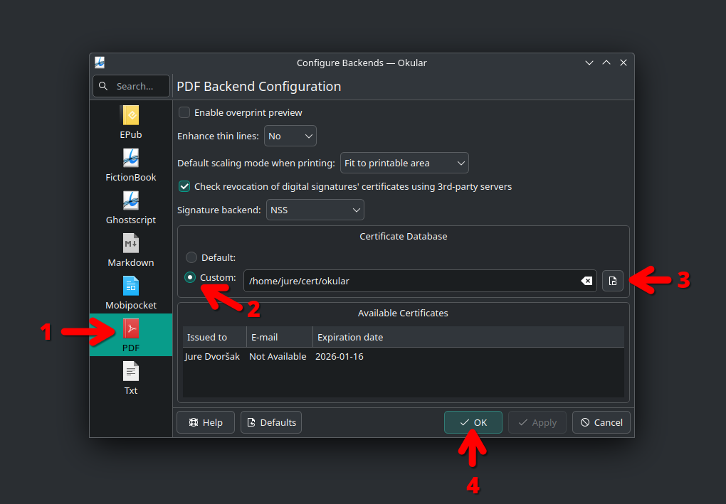 1. Now select PDF in the sidebar, select Custom in Certificate Database group and click Open File Dialog button to select previously created directory (e.g. ~/cert/okular).